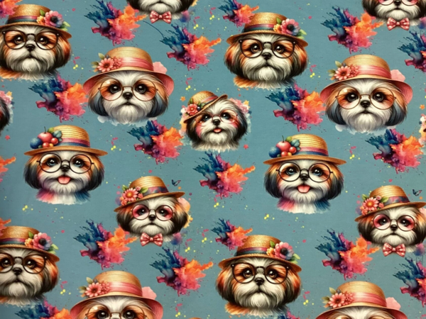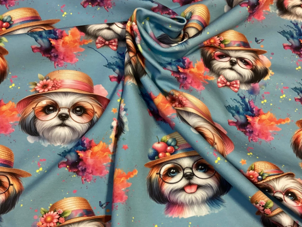 Auf Lager Shih-Tzu Hund Summer Splash BLAU French Terry Meterware Eigenproduktion